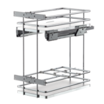 Podwójny kosz z serii Galaxy z prowadnicami bocznymi, do korpusu 400 mm. Owalny chromowy drut z białym pełnym dnem. W opakowaniu znajduje się mocowanie frontu umożliwiające regulowanie w trzech poziomach. Skryta prowadnica pełnego wysuwu z tłumieniem.