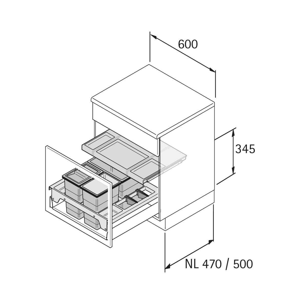 Kosz InsertFlex 600 Można stosować w szufladach ArciTech, wysokość systemu 186 mm lub 218 mm, wysokość profilu bocznego szuflady 94 mm, długość nominalna (NL) 500 mm lub InnoTech Atira, wysokość 144 mm lub 176 mm, długość nominalna (NL) 470 mm Wysokość montażowa 345 mm od górnej krawędzi dna szuflady Ramka montażowa jest montowana na relingu […]