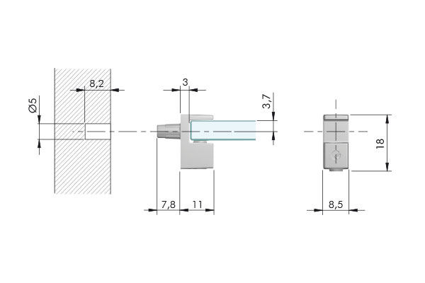 GRACE to podpórka do półek szklanych o unikalnym wyglądzie, nowoczesnej i świeżej estetyce. Podpórka GRACE umożliwia bezpieczne dostarczenie szaf z zamontowanymi półkami. Wyposażona w specjalną wkładkę z tworzywa sztucznego w dolnej części, podpórka doskonale blokuje półkę i zmniejsza ryzyko uszkodzenia szkła. Dzięki podpórce GRACE blokowanie i odblokowywanie półki jest absolutnie szybkie i łatwe. GRACE jest dostępna w wersji  do półek szklanych o grubości 5-6 mm. Typy montażu: z trzpieniem Ø 5 mm.