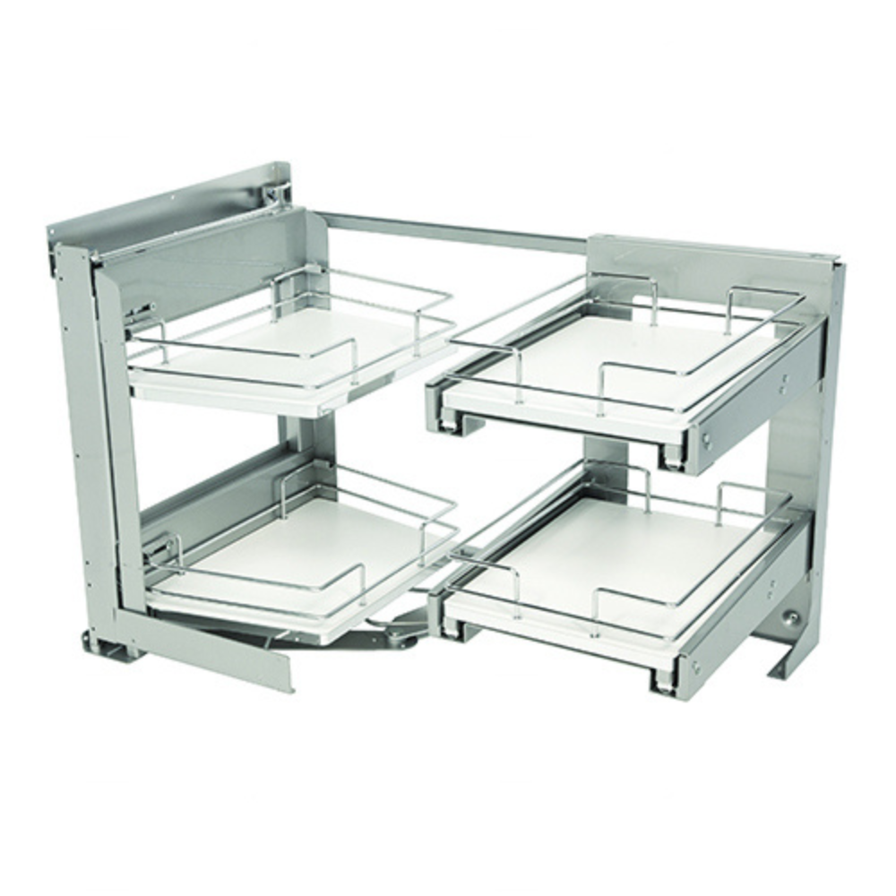 Wysuwany kosz do szafki narożnej z serii Galaxy z możliwością wysunięcia koszy wewnętrznych dzięki prowadnicy pełnego wysuwu. Owalny drut w kombinacji z pełnym dnem. Lewy = wyjeżdza w lewą stronę. Razem z cichym domykiem (cały system i poszczególne kosze wewnętrzne).