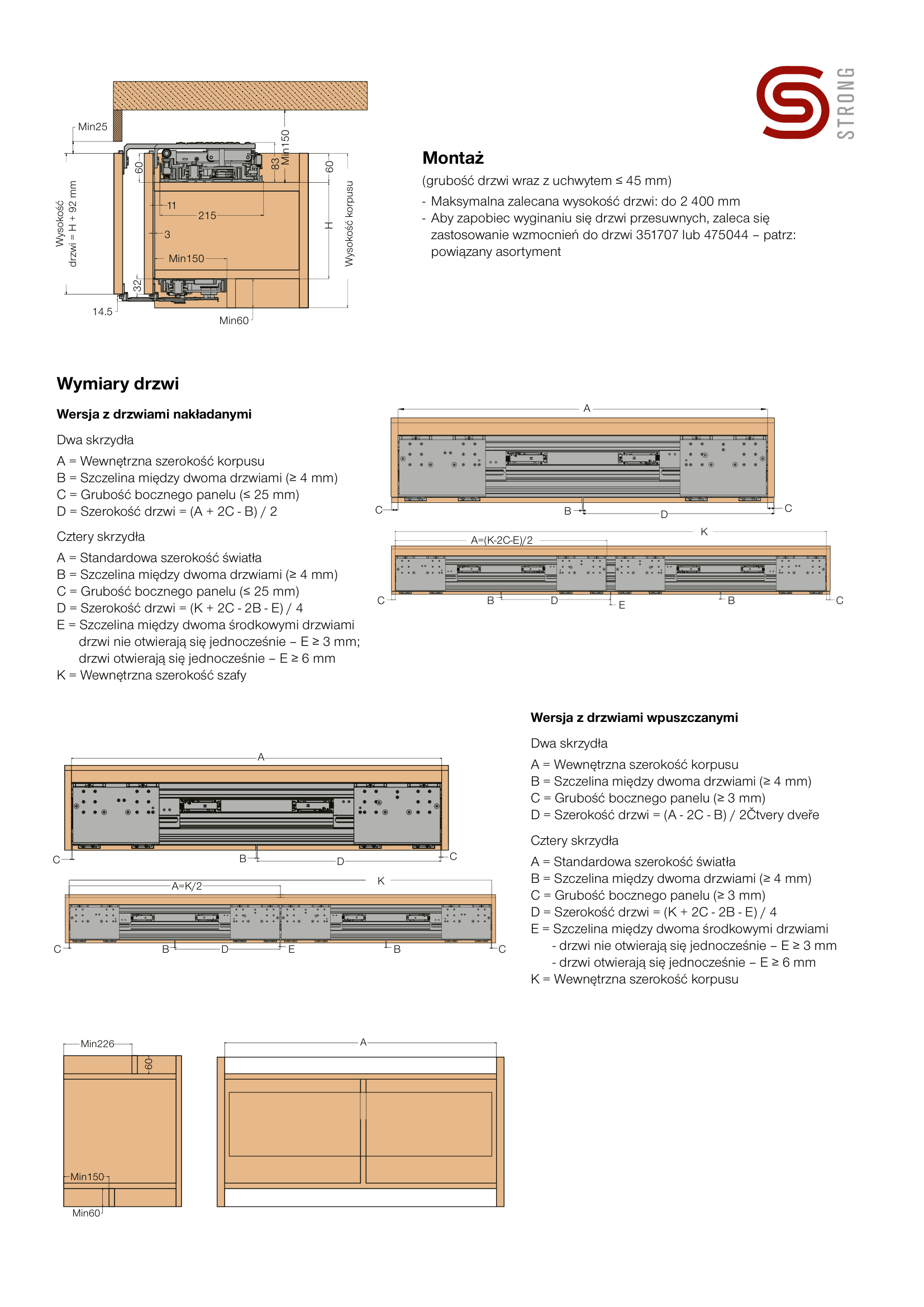Zestaw okuć do dwóch drzwi w jednej płaszczyźnie. Przeznaczony dla zewnętrznej szerokości szafy 1650 – 2050 mm, dla grubości materiału 16–45 mm. Udźwig jednego skrzydła – 80 kg. Maksymalna zalecana wysokość drzwi – 2400 mm. Aby zapobiec odkształcaniu drzwi, zdecydowanie zaleca się stosowanie okuć wyrównujących.