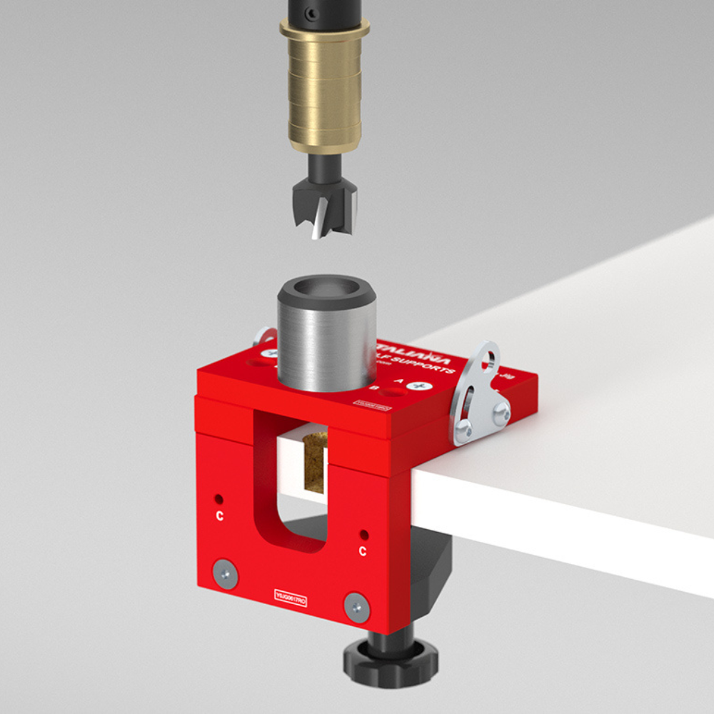 Łatwe i praktyczne narzędzia do wiercenia, przeznaczone do montażu mebli bez użycia maszyn przemysłowych. Niska waga i wymiary sprawiają, że szablon wiertarski nadaje się również do użytku na placu budowy. Tulejowe prowadnice wiertarskie gwarantują proste i precyzyjne wiercenie. Tulejowe prowadnice wiertarskie posiadają boczne otwory, które umożliwiają usuwanie wiórów podczas wiercenia. Boczne wsporniki ułatwiają precyzyjne pozycjonowanie szablonu wiertarskiego. Zintegrowane pokrętło blokujące zapewnia solidne mocowanie, niezbędne do szybkiego i bezpiecznego wiercenia. Informacje nadrukowane na powierzchni szablonu ułatwiają dokładne ustalenie położenia otworów.