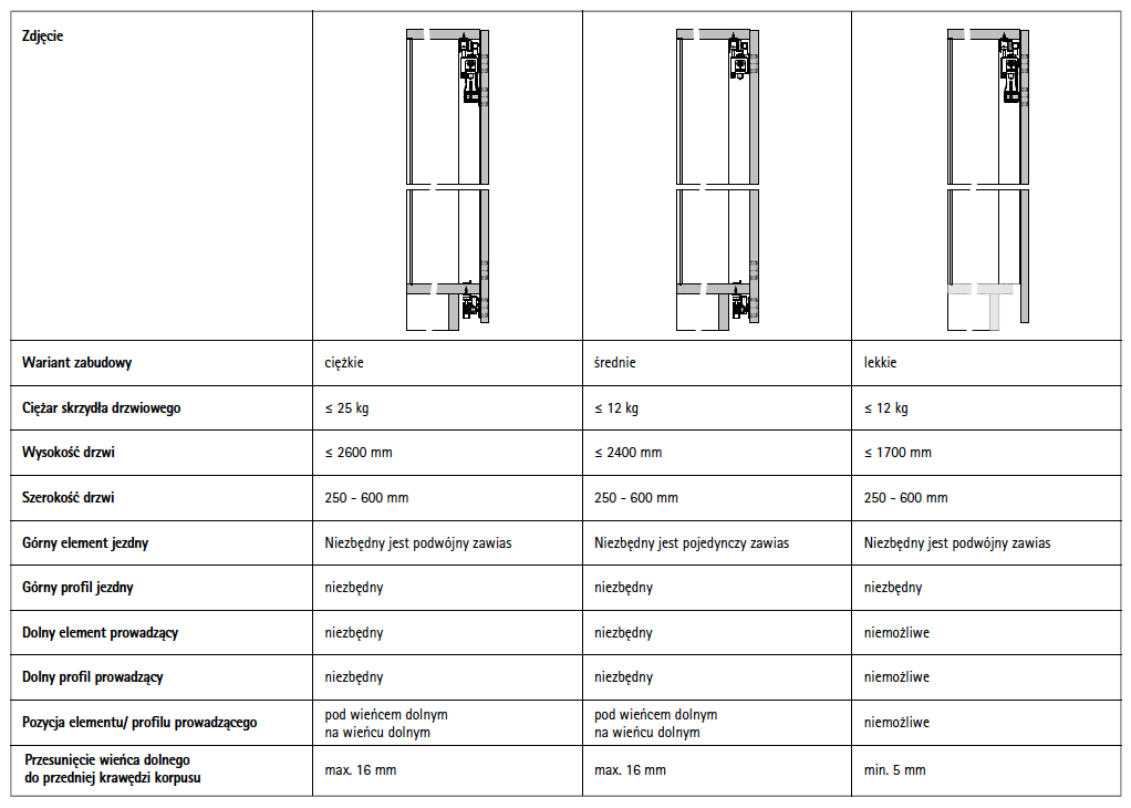 - Dolne prowadzenie: Tak (do okuć ciężkich lub średnich) | Nie (do okuć lekkich)