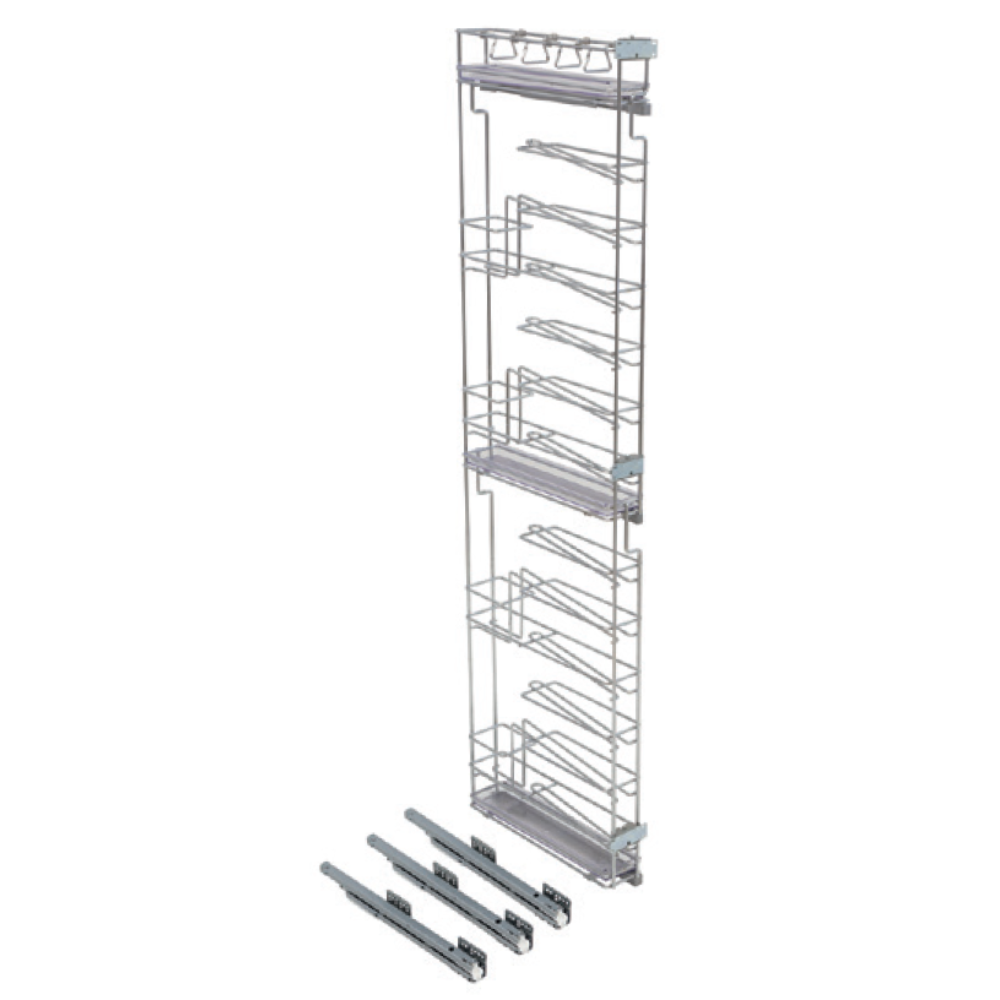 Cargo wysokie z pięcioma koszami do szafki 150 mm. Montaż po prawej stronie (prowadnica Grass pełnego wysuwu z tłumieniem). Nośność 60 kg.