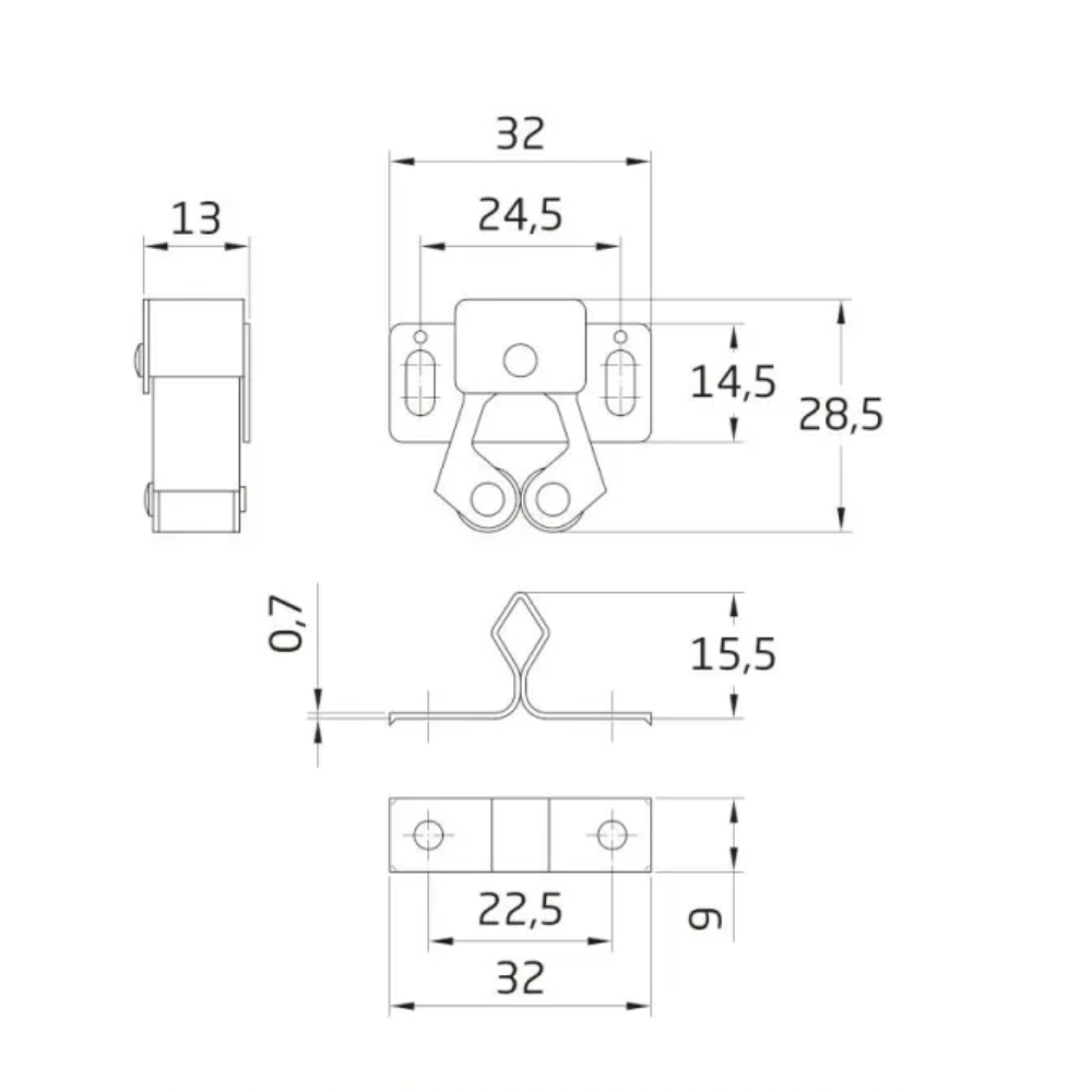 Zatrzask meblowy włoski, rolkowy, ocynk Wymiary: 32 x 26mm Materiał: najwyższej jakości blacha ze stali węglowej walcowanej na zimno Wykończenie: cynkowany (cynk galwaniczny zapewnia odporność na rdzę w teście natrysku SALT wyższą niż 48 godzin zgodnie z amerykańską normą ASTM B 117 (ISO 9227)) Nylonowe rolki Dostarczany ze śrubami do montażu